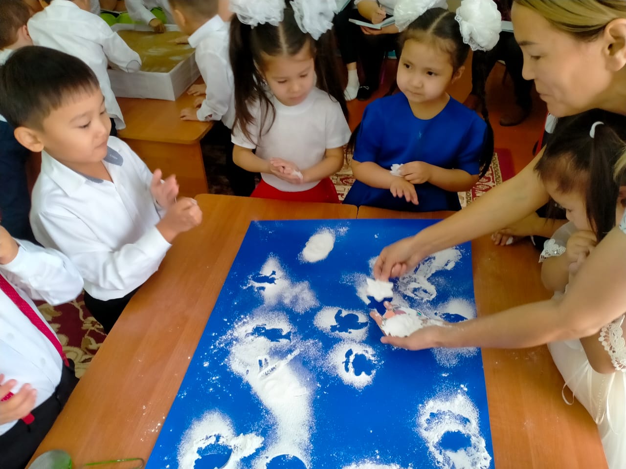 Шарты: құрғақ шекер пудрасы арқылы көк фонға сүзекінің көмегімен суреттер салу.