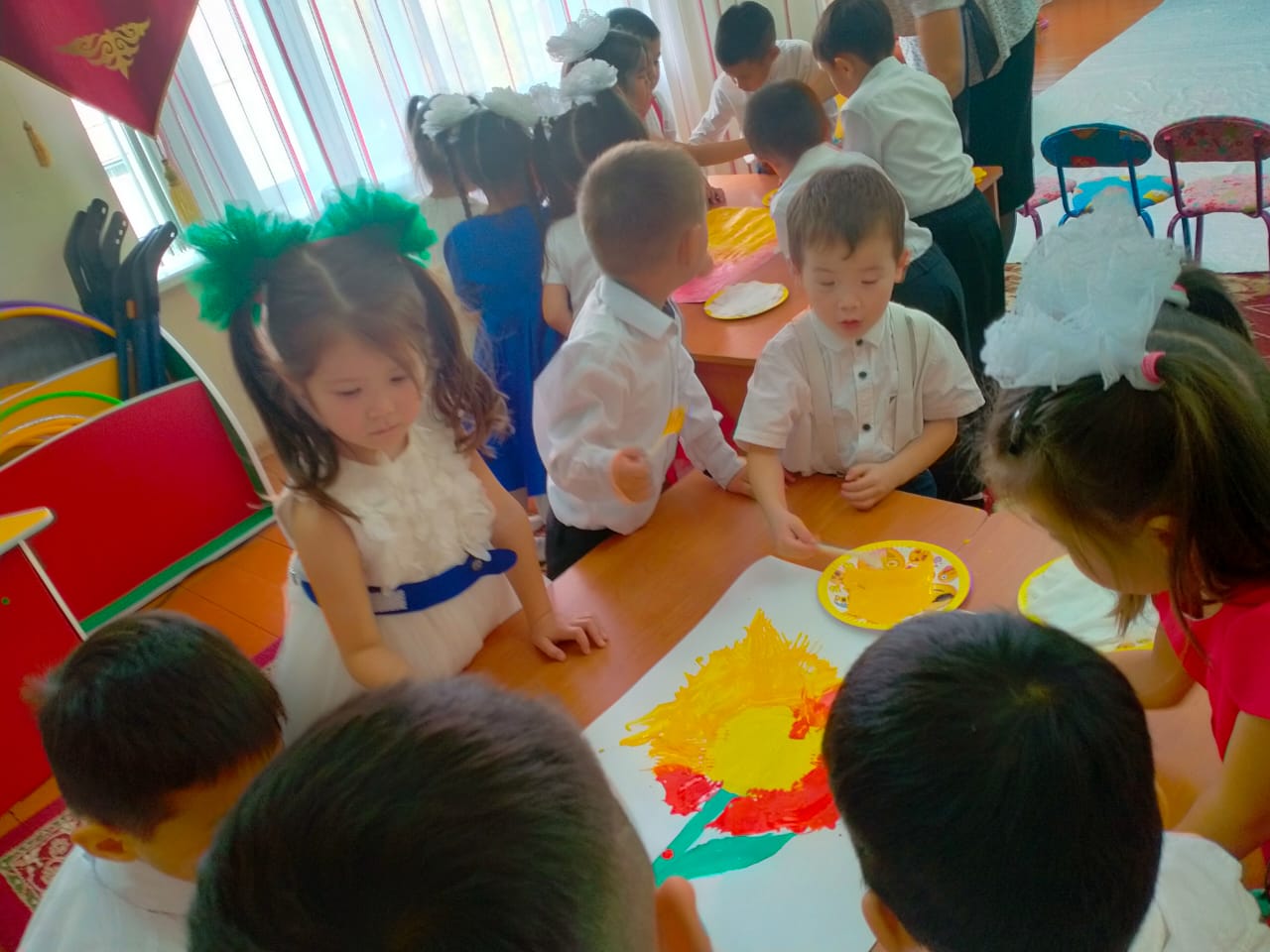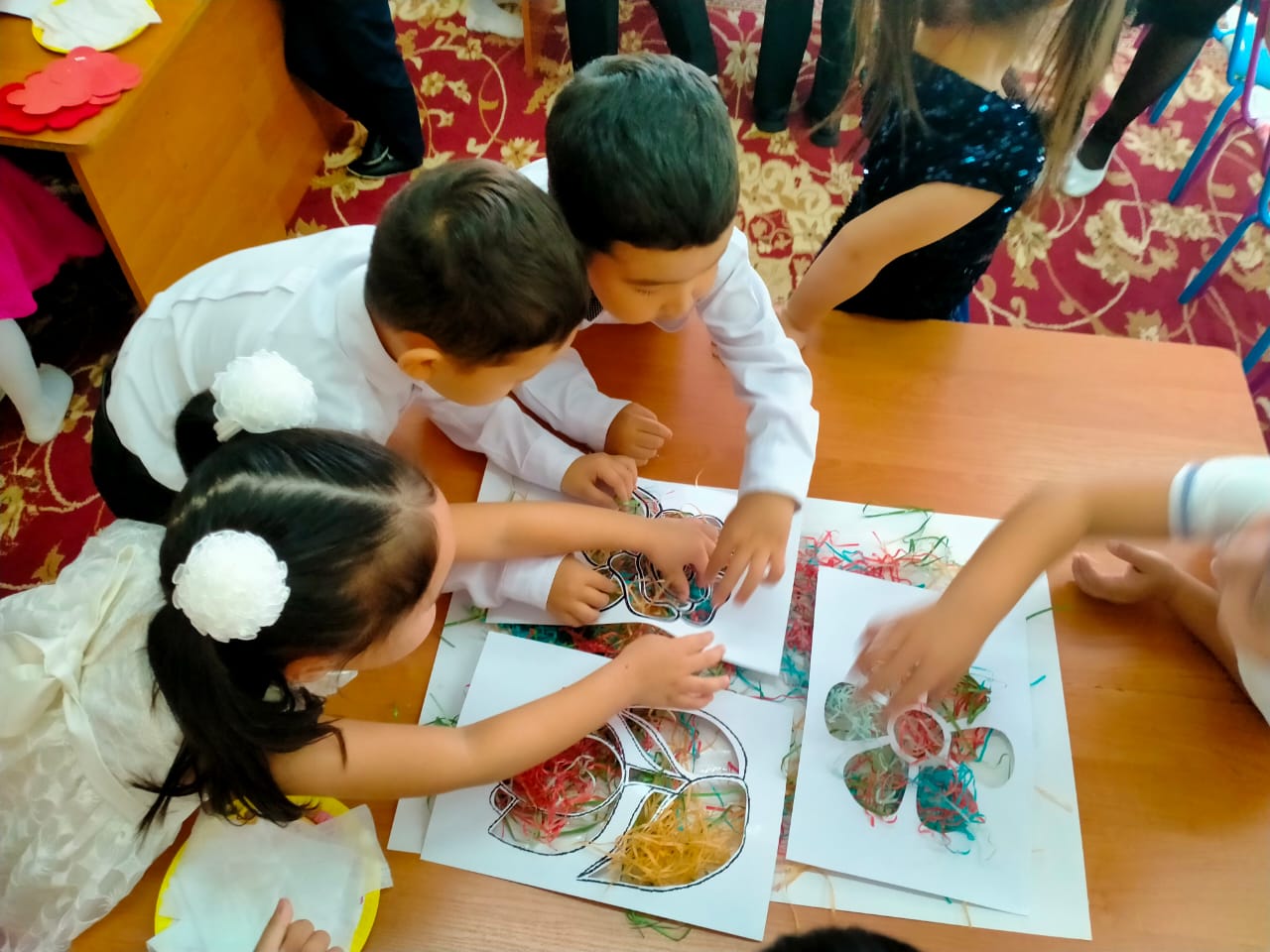 Шарты: балалар дәстүрден тыс түрлі-түсті гуашпен бір реттік шанышқының көмегімен гүлдің суретін салады.