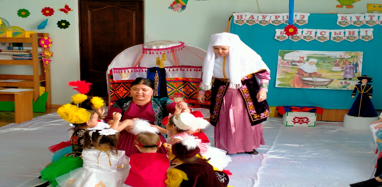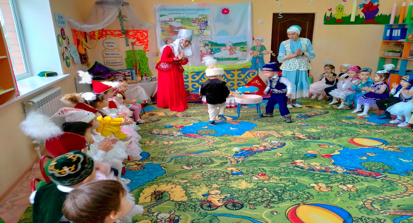 Жүргізуші: Жарайсыңдар балалар! Қазақ халқы –бай, қонақжай, өнерлі халық, қандай мақтау айтсада артықтық етпейді. Осындай мерекеде ұлттық ойын ойнамасақ ұят болар. Әже емерелеріңіз сізге қазақтың ұлттық ойындарын ойнап көрсетеді