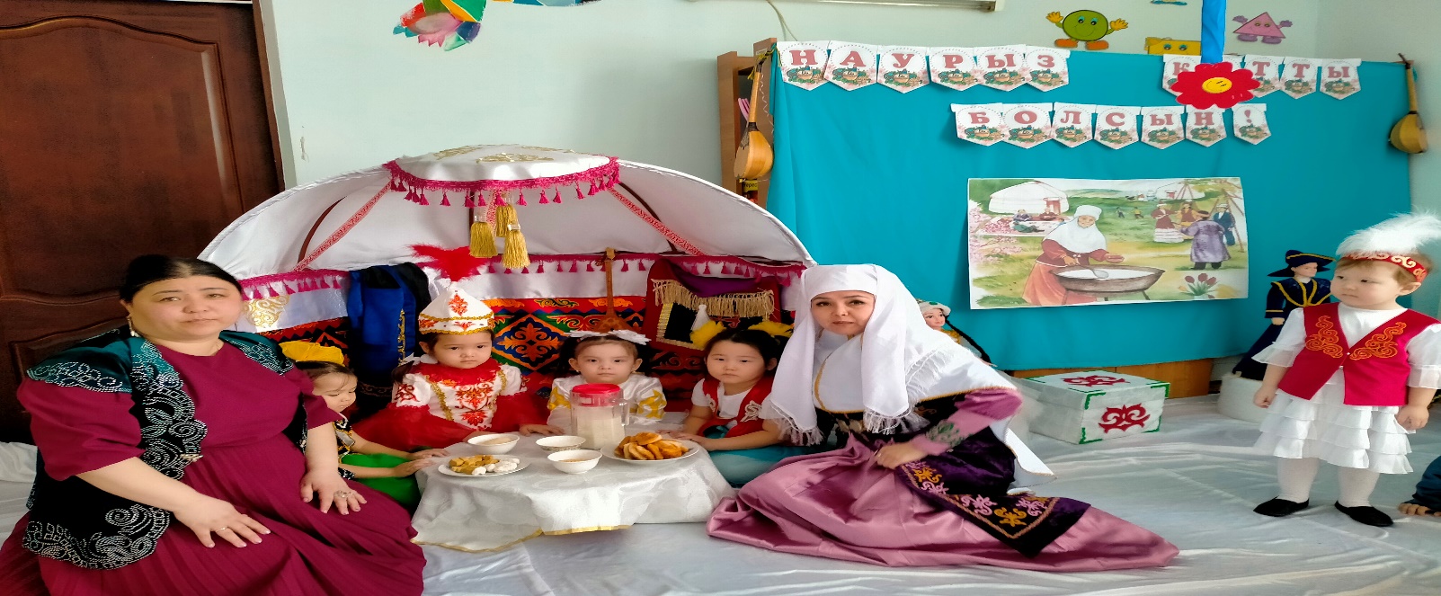 Наурыз мерекесі құтты болсын! Тамыры терең, дәстүрі жаңарған мейрамдарыңыз құтты болсын! Ақ мол болсын! Балалар амансыңдар ма мереке құтты болсын. Қандай әдемі болып киінгенсіңдер. Көңіл күйлерің қалай жақсы ма? Ұлыстың ұлы күнінде үйімізге көп қонақтар келеді. Қонақ көп болса ырыс несібе көп болады дейді ата әжелеріміз. Бір дыбыс естіледі бізге қонақ келе жатыр екен.