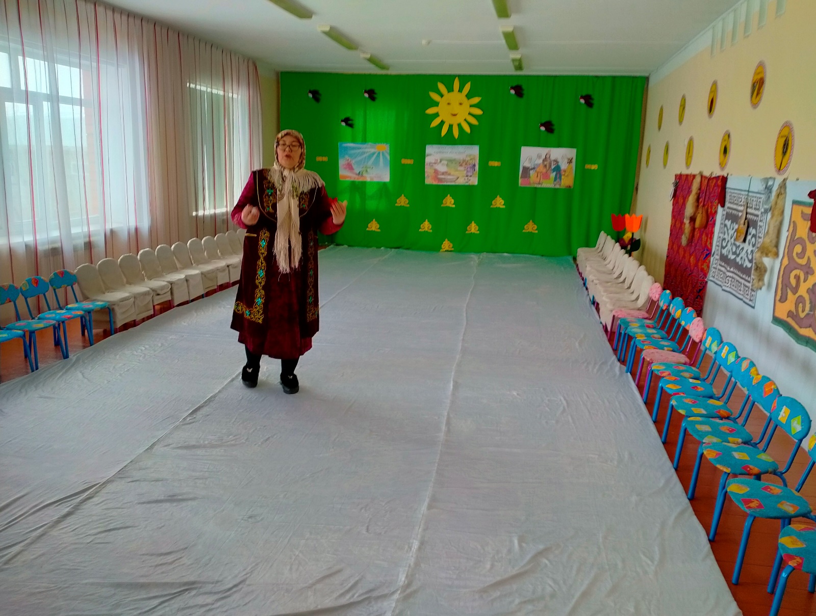 Зал іші безендірілген ортада Әже жүреді.