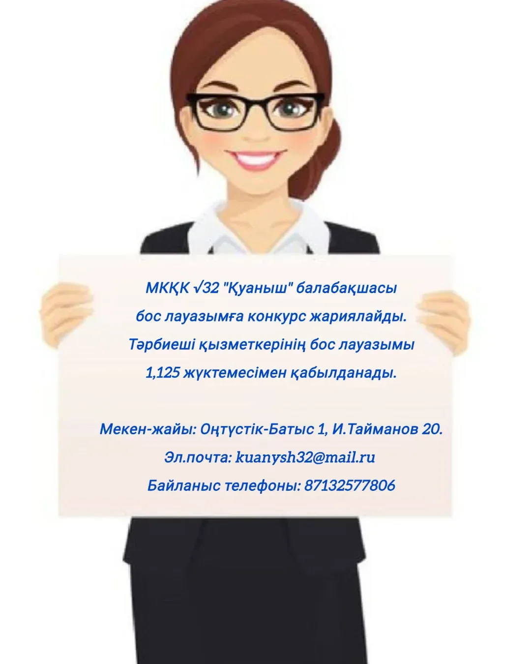 ҚР Білім және ғылым министрінің 21.02.2012 жылғы №57 бұйрығы, ҚР Білім және ғылым министрінің 19.11.2021ж. √568 және ҚР Еңбек және халықты әлеуметтік қорғау министрінің 22.11.2021 √432 бірлескен бұйрығы, ҚР Оқу - ағарту министрінің 22.12.2022 √513 бұйрығы негізінде МКҚК №32 «Қуаныш» балабақшасы декреттік уақытша тәрбиеші лауазымы орнына 1.125 жүктемесі бойынша бос лауазымына конкурс өткізеді. Балабақшаға бос лауазымдар туралы ақпаратты жұмыспен қамту орталығының «enbek.kz» сайтына, балабақшаның https://kuanysh32.edu.kz ресми сайтына, балабақшаның инстаграмм «kuanishmdu_32» және фейсбук парақшаларынан көруге болады;