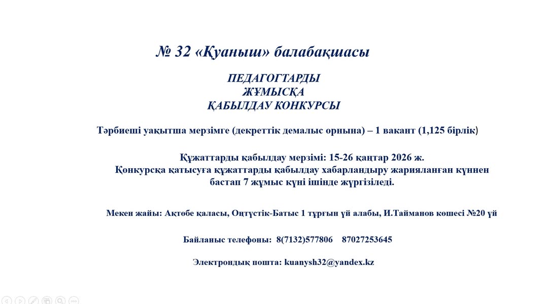 МКҚК №32 «Қуаныш» балабақшасы педагогтерді конкурстық негізде жұмысқа қабылдау.