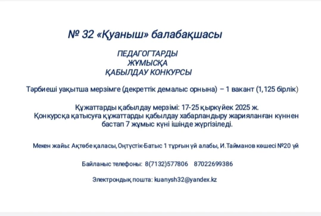 МКҚК №32 «Қуаныш» балабақшасы педагогтерді конкурстық негізде жұмысқа қабылдау. Тәрбиеші лаувзымына уақытша мерзімге (декреттік демалыс орны) -1 вакант (1,125 бірлік).
