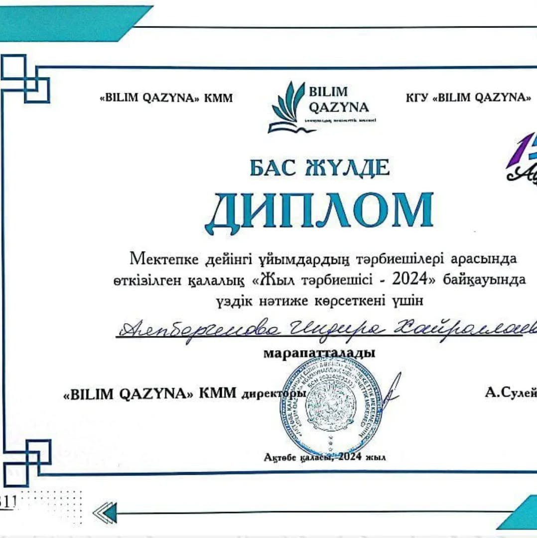 Мектепке дейінгі ұйымдардың тәрбиешілері арасында өткен қалалық "Жыл тәрбиешісі - 2024" байқауында үздік нәтиже көрсеткені үшін №32 "Қуаныш" балабақшасының тәрбиешісі Аяпбергенова Индира Хайроллаевна БАС ЖҮЛДЕ ДИПЛОМЫМЕН марапатталды.