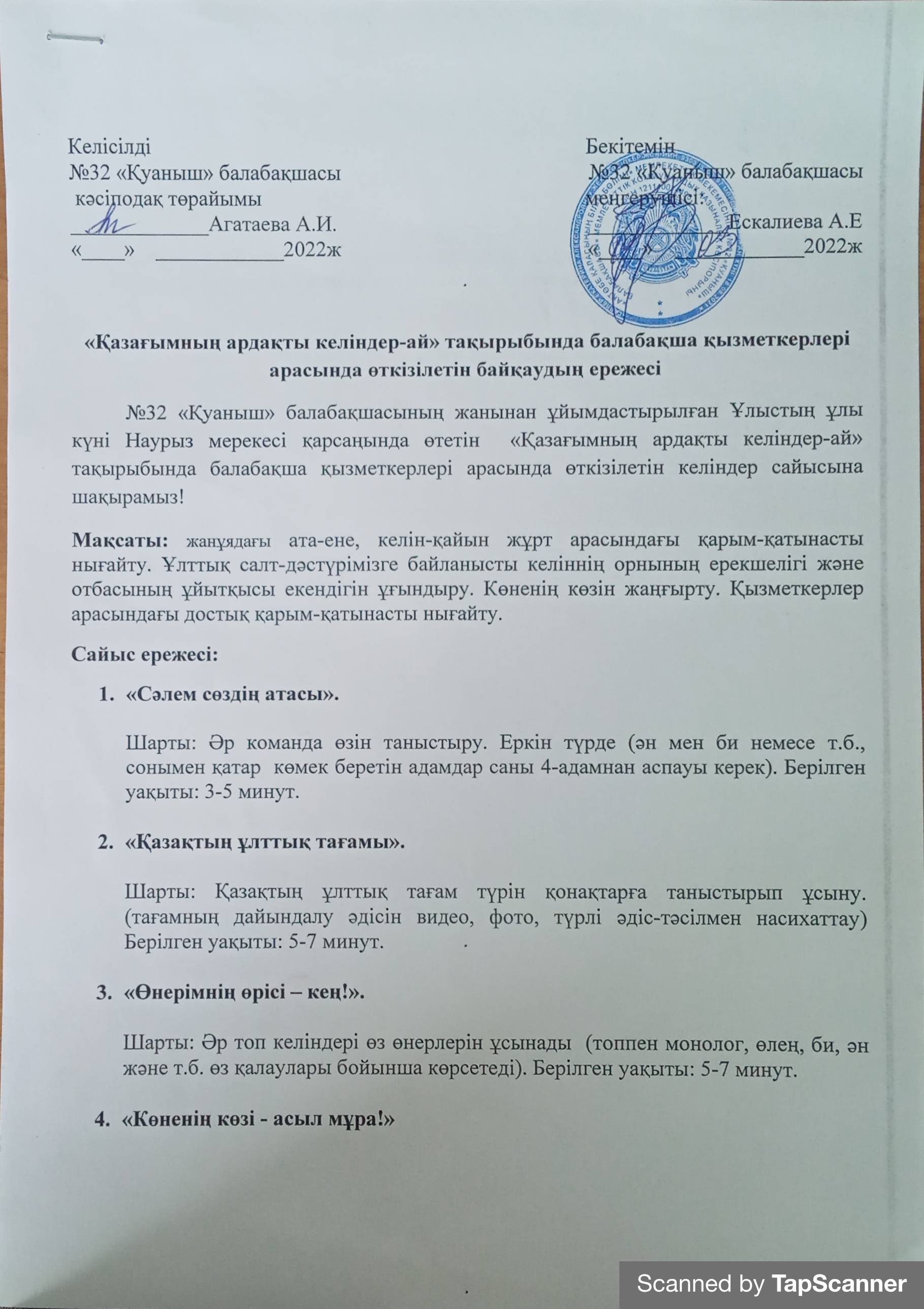 №32 «Қуаныш» балабақшасында Ұлыстың ұлы күні Наурыз мерекесі қарсаңында балабақшамыздың кіші қызметкерлері арасында «Қазағымның ардақты келіндері-ай!» тақырыбында байқау өтті. Байқаудың әділқазылар алқасына педагог зейнеткерлері Абдуллина Б.Б., Нуртазиева Н.М. және «Райгүл» балабақшасының меңгерушісі Шукурова М.К. шақыртылды. Байқау соңында әділқазылар алқасы байқау қатысушыларына әділ бағаларын беріп, сыйлықтар табыстады және де Алғыс хатпен марапаттады.